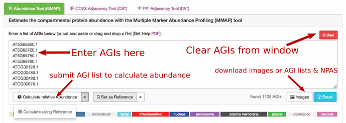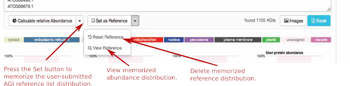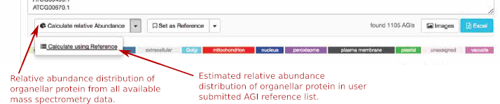 When submitting a list of AGIs through the drag-and-drop window, the marker proteins are identified from the list and the relative abundance is calculated for each compartment. The tool output shows the number of Arabidopsis proteins and the standard abundance distribution derived from all observed TAIR10 AGIs on the left and for the submitted user AGI list on the right, respectively. The tool also allows users to submit their own reference to calculate the abundance from.