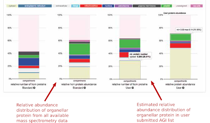 The user submitted data (right 2 bars): The third bar graph from the left shows the number of AGIs in each compartment for the user-submitted list of AGIs according to hits in the HCM list (The user AGI list is compared to the HCM list and the hits are being identified and summed per compartment). The right bar graph shows the calculated abundance distribution in the user-submitted sample and normalizes is to the total of 1 (relative abundance distribution of organellar protein in the user sample). This will show any enrichment of organellar protein.